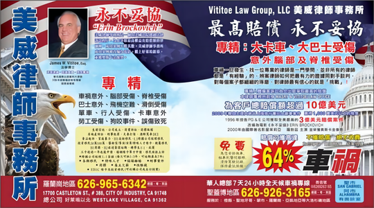美威律师事务所Vititoe Law Group,LLC ,美威律师有35年法律经验,国家级权威,国际着名大律师,多次往返中美两国,深谋远虑,认真负责,态度审慎,处处以客户权益为重,具有很的高信誉【成功率极高】本事务所7天24小时全天候电话专线 (626)926-3165,或(626)383-4520 通国丶粤丶英语。E-Mail:rowlandlaw@gmail.com. 微信号:w6269263165.